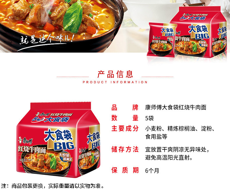 康师傅 大食袋红烧牛肉面 120g*5袋 方便面泡面