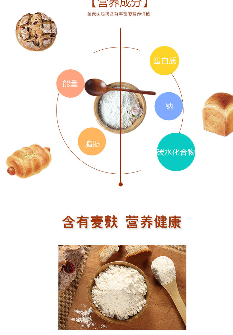风筝牌全麦面包粉2.5kg含麦麸 烘焙原料 面包机烤箱
